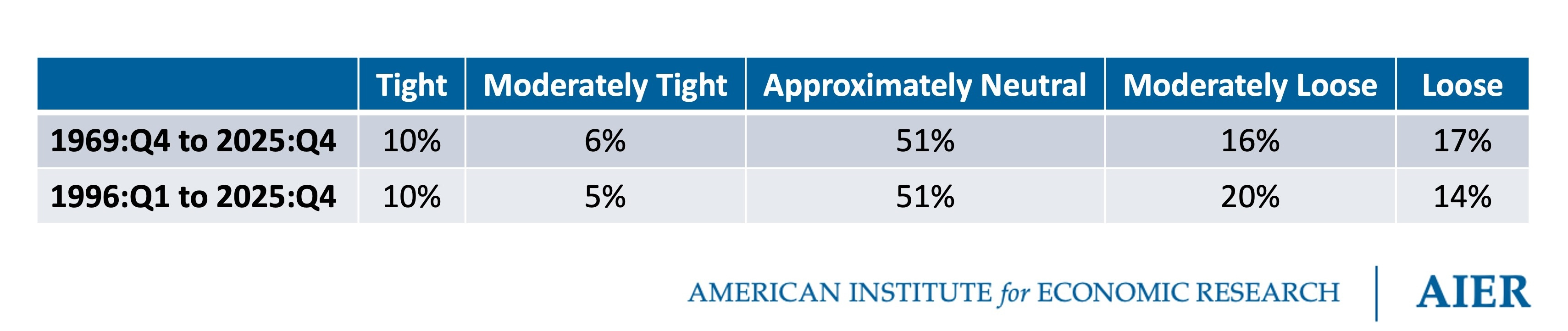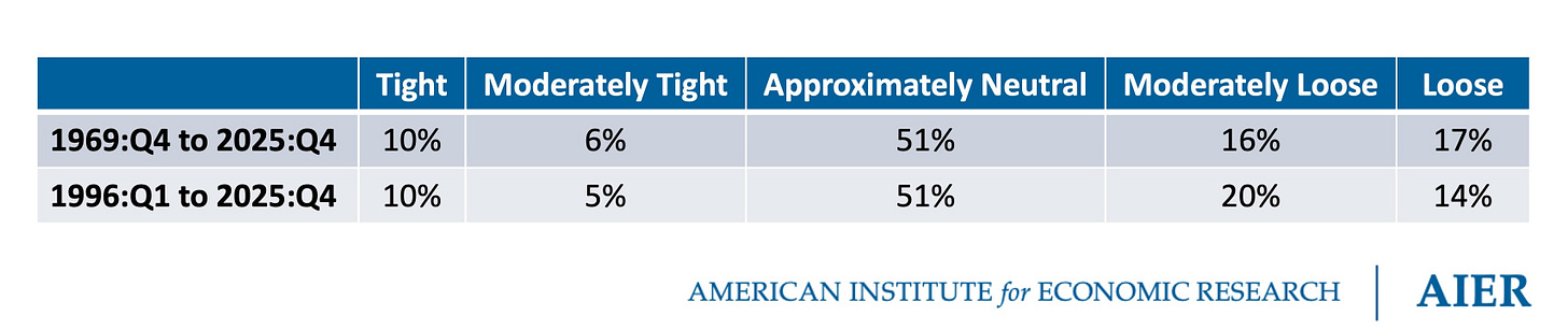 The nominal spending gap is used to classify the stance of monetary policy in each quarter as Tight (Less than -1.25%), Moderately Tight (-1.25% to -0.75%), Approximately Neutral (-0.75% to 0.75%), Moderately Loose (0.75% to 1.25%), or Loose (Greater than 1.25%). The share of quarters in each category is presented in the following table for the 1969:Q4 to 2025:Q4 and 1996:Q1 to 2025:Q4 periods.