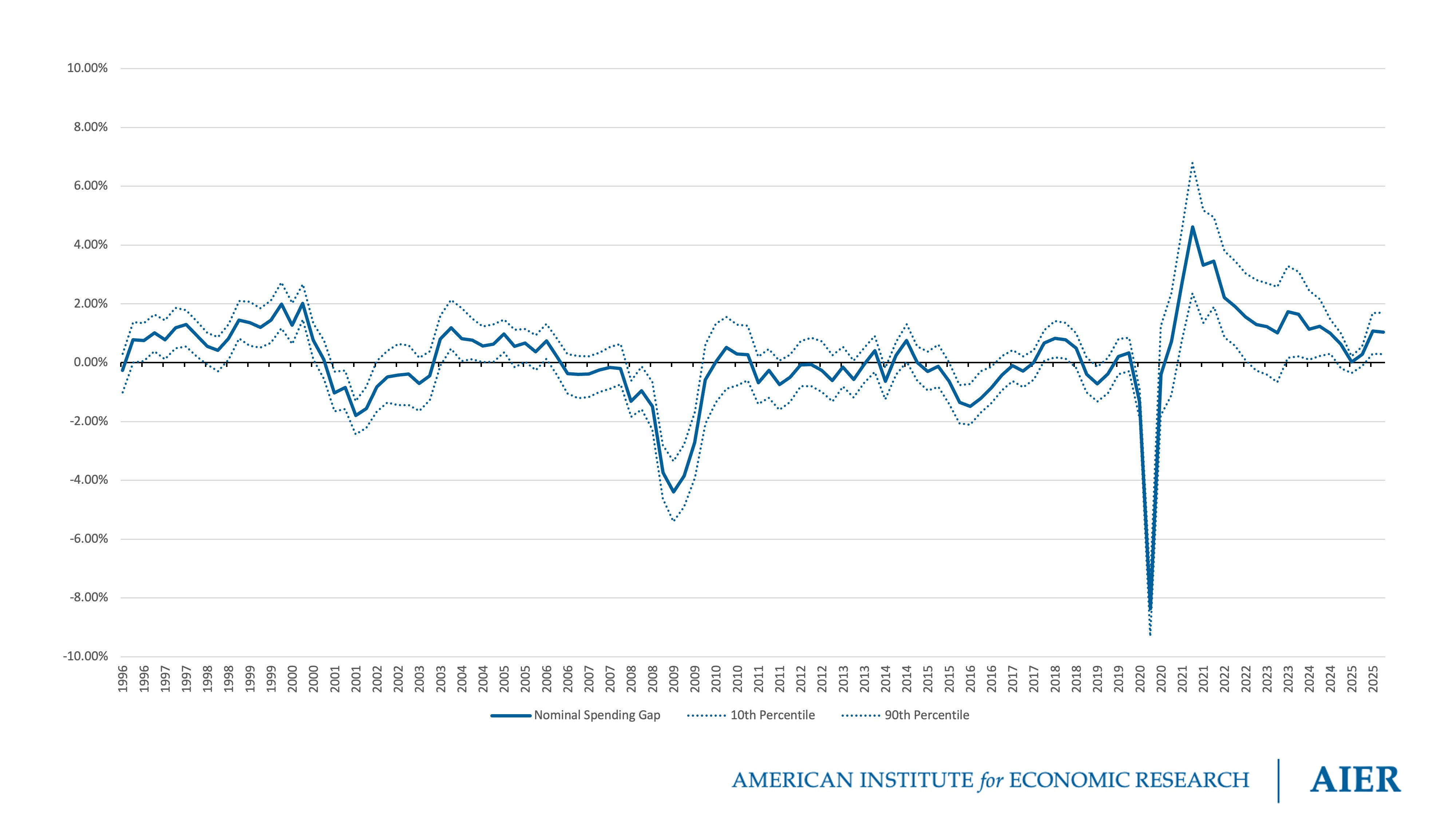 The nominal spending gap surged to 4.46 percent in 2021:Q2, before declining to 0.92 percent in 2023:Q2. It then rebounded to 1.56 percent in 2023:Q3 and remained elevated at 1.44 percent in 2023:Q4. It declined to 0.03 percent in 2025:Q1 before rebounding over the last three quarters.