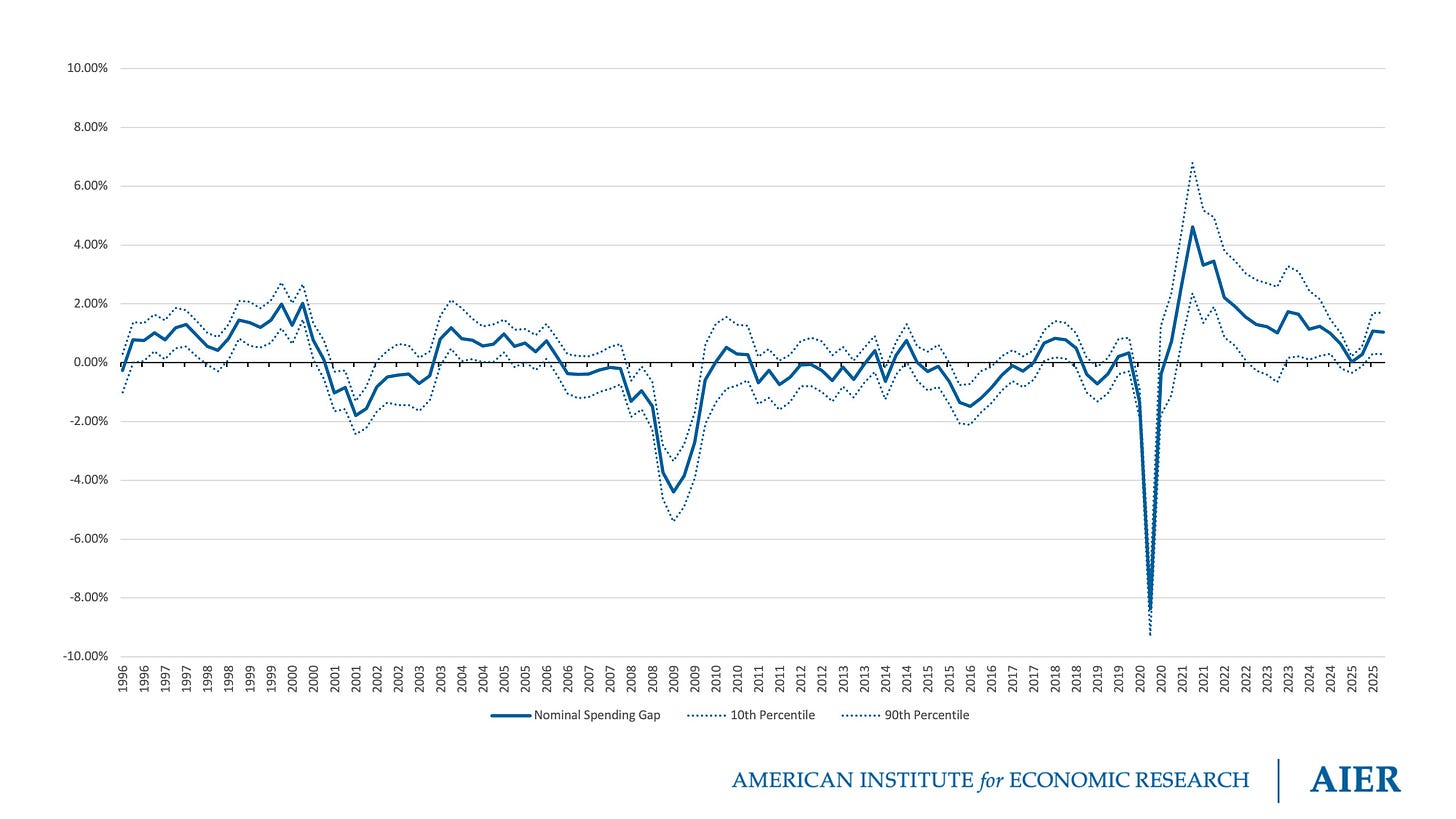 Nominal spending exceeded its neutral level in 2025:Q3, resulting in a nominal spending gap of 1.04 percent. The confidence interval ranged from 0.29 percent (10th percentile) to 1.70 percent (90th percentile). The nominal spending gap suggests that monetary policy remained moderately loose in 2025:Q4.