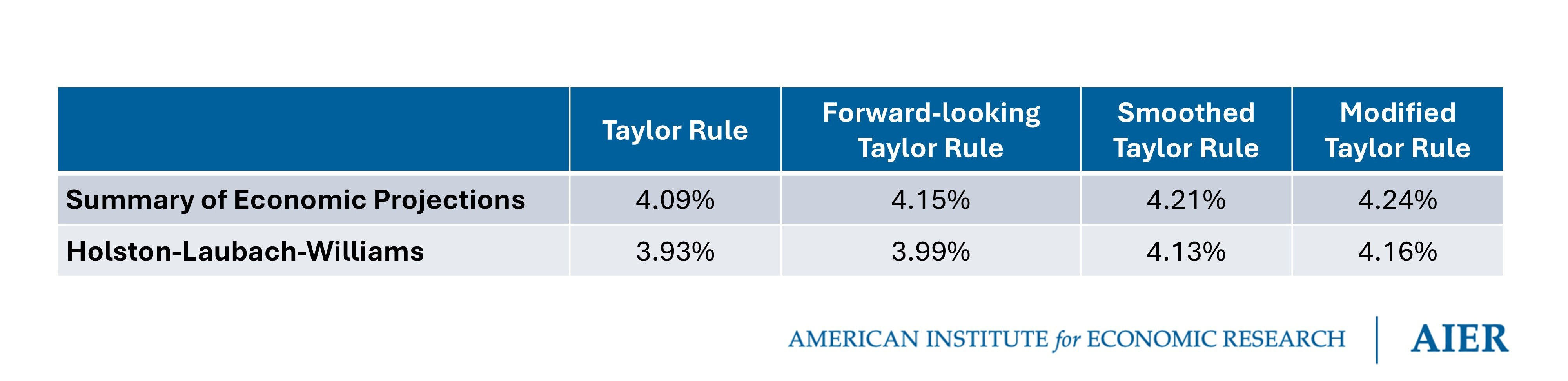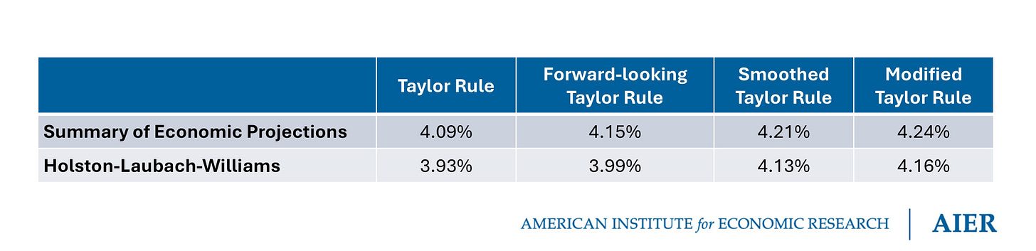 Estimates for the original, smoothed, forward-looking, and modified (i.e., smoothed and forward-looking) Taylor rules are presented in Table 1. Two estimates are constructed for each rule. The first estimate uses the median projected longer run federal funds rate in the most recent Summary of Economic Projections as a proxy for the nominal neutral rate of interest, rt* + πt*. The second estimate uses the New York Fed’s Holston-Laubach-Williams estimate for the real interest rate, rt*.