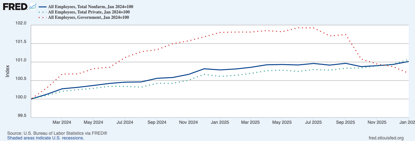Whereas total employment has grown steadily, government employment has declined significantly over the last six months. From January 2024 to January 2025, the last year of the Biden administration, government employment increased 1.8 percent, compared with just 0.6 percent growth in private employment. That trend has reversed under the Trump administration. In January 2026, government employment was just 0.7 percent higher than it had been in January 2024 whereas private employment was 1.1 percent higher.