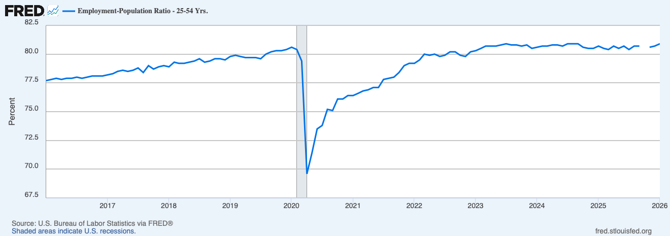 Prime-age employment remains strong. In January 2026, 80.9 percent of those 25 to 54 years old were employed, compared with 80.7 percent in December 2025. For comparison, 80.6 percent of prime-age workers were employed just prior to the pandemic.