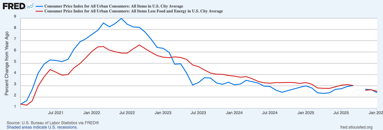 Prices… Inflation cooled in January, the Bureau of Labor Statistics reported last week. The Consumer Price Index grew at a continuously compounded annualized rate of 2.0 percent in January 2026. CPI inflation has averaged 2.7 percent over the past six months and 2.4 percent over the past twelve months.