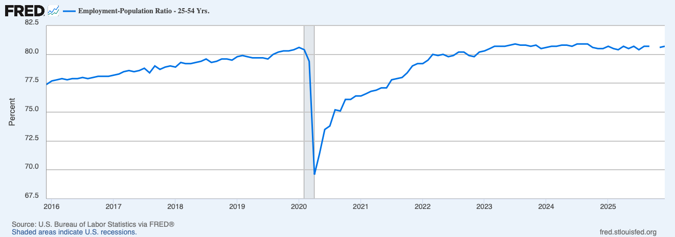 Prime-age employment remains strong. In December 2025, 80.7 percent of those 25 to 54 years old were employed, compared with 80.6 percent in November 2025. For comparison, 80.6 percent of prime-age workers were employed just prior to the pandemic.